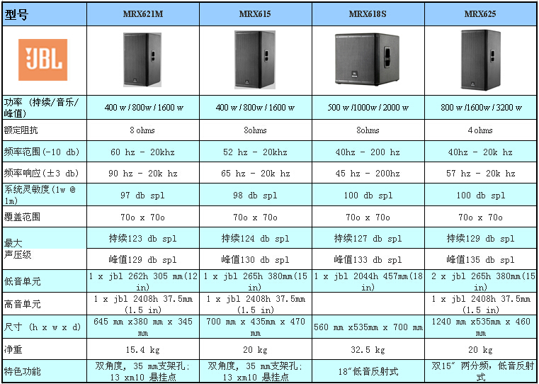 该系列包括MRX612M, MRX615,MRX625 三款全频扬声器 和MRX618S, MRX628S两款超低音扬声器。
